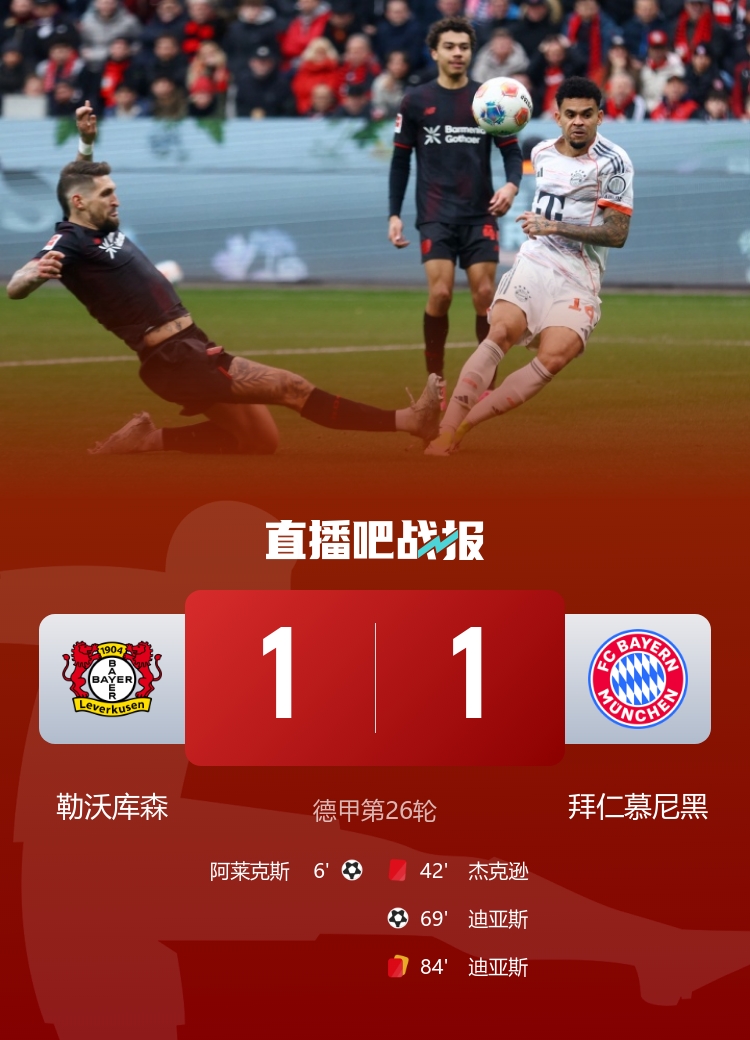 7连胜终结+9分领跑!九人拜仁1-1药厂 迪亚斯扳平+染红杰克逊直红
