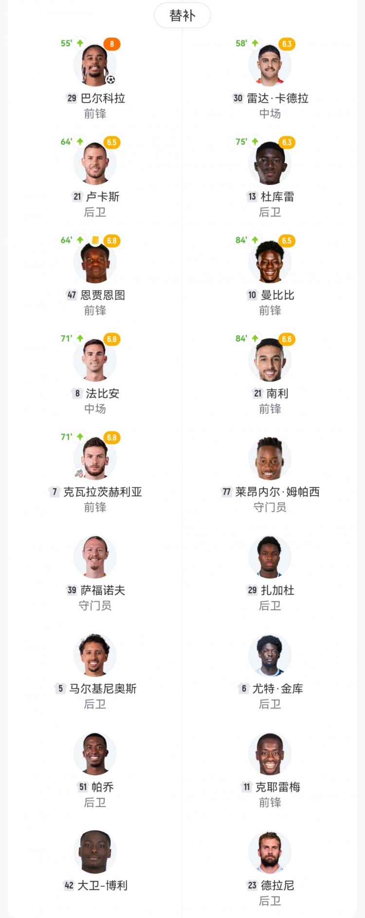 第87分钟,克瓦拉茨赫利亚送出直塞打穿防线,巴尔卡拉凭借速度优势外线绕身前完成进球!巴黎3-0领先↓