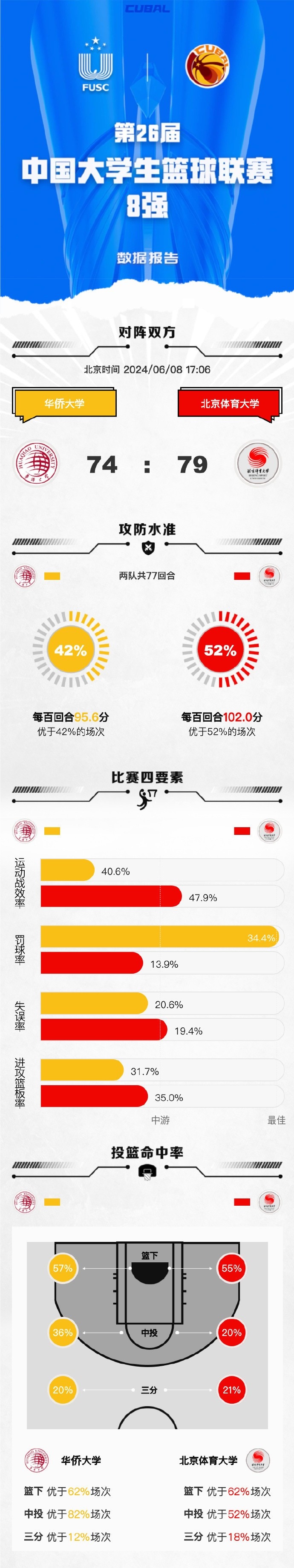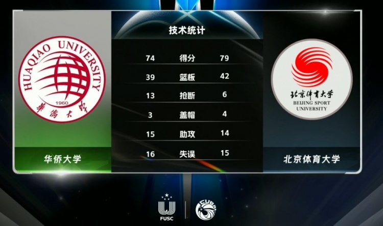 末节开局北京体大虽然外线依旧不准,但陈宇宸命中个人第三记、同时也是球队第三记三分,加上谢智杰的2+1进球,北京体大10-2开局直接拉开两位数分差占据绝对上风。大比分落后的华侨大学尝试抢三分但效果一般,抢分阶段虽然依托叶润峰的三分和李绪建的2+1追至8分但时间所剩不多。北京体大打得很乱但胜在优势大容错率高,最后华侨大学不断抢三分但时间已经不够创造神奇。最终,北京体育大学79-74力克华侨大学拿下比赛。
