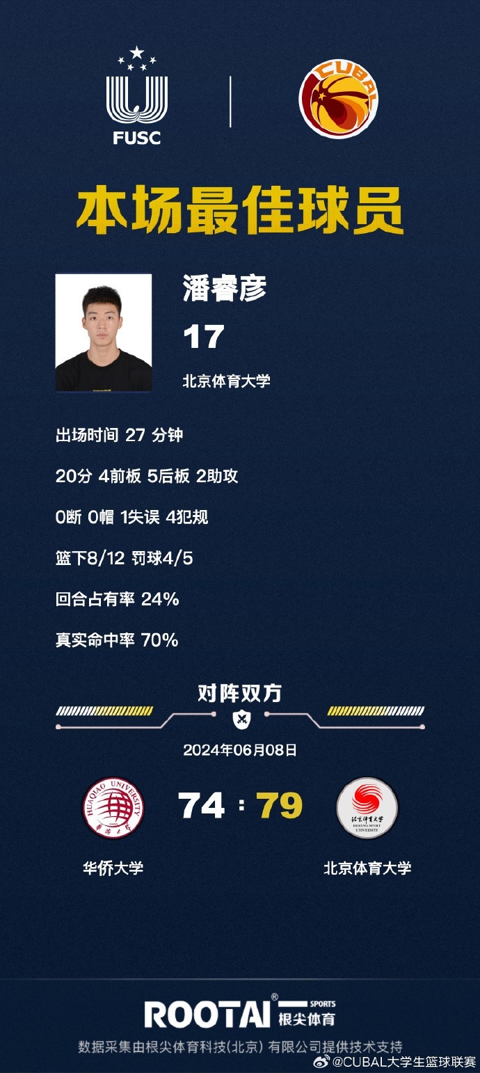 北京体育大学:杨腾飞 13分5篮板、林思阳10分11篮板、陈宇宸9分、鲁鹭8分5篮板、潘睿彦20分9篮板、谢智杰19分9篮板8助攻。