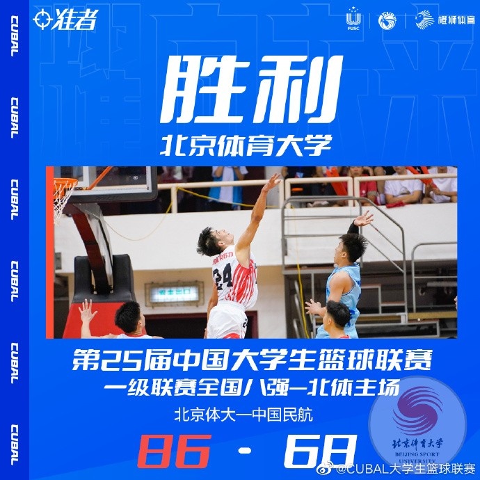 末节决战,尼加提上来又中三分,北体大抓反击,谢智杰妙传杨腾飞送出漂亮隔扣将分差再次拉开20分以上,随后中国民航进攻端略显急躁,接连单打误攻效果不佳,又是张汪群站出来接连外线发炮追分,谢智杰5犯被罚下,但张汪群也是连吃2T被直接罚出场,最终北体大86-68大胜中国民航,先下一城。