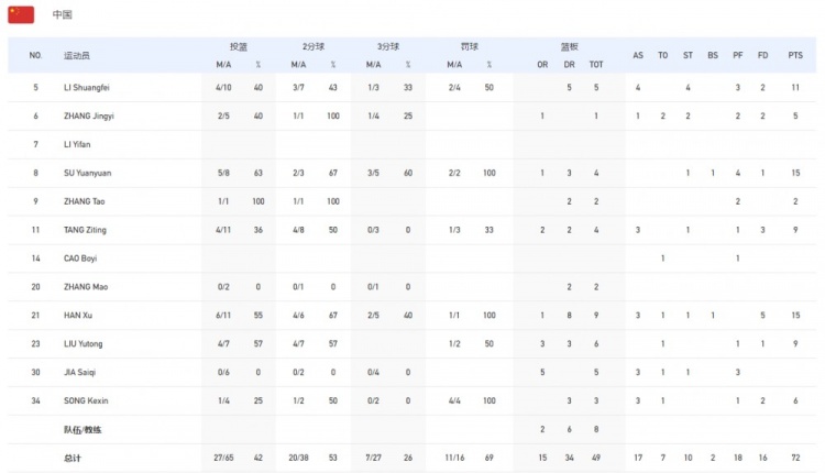 中国队数据:韩旭15分9篮板3助攻,苏源圆15分4篮板,李双菲11分5篮板4助攻4抢断,张敬一5分2抢断,张涛2分2篮板,唐子婷9分4篮板3助攻,刘禹彤9分6篮板,贾赛琪5篮板3助攻,宋珂昕6分3篮板3助攻