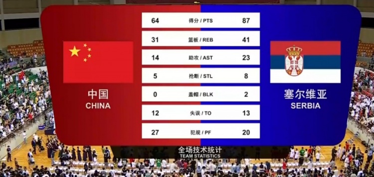 首节开局男篮慢热表现相当糟糕,各种失误和打铁直接送给对手快速反击机会并让塞尔维亚打出11-0的开局。胡明轩的罚球和胡金秋连拿5分的表现帮助男篮打破进攻端局面,但防守端始终无法限制对手导致首节落后11分。次节中国男篮状态调整过来不像首节那么被动,不过几次进攻端打成后都被对手追着屁股打了反击,最后赵睿踩着三分线命中远投,男篮28-43落后塞尔维亚15分进入下半场。休息归来中国男篮状态继续回暖,赵睿和周鹏的远投帮助球队将劣势迫近至个位数;奈何塞尔维亚这边外线三分相当精准,分差也始终维持在10分出头;塞尔维亚则在末节最后时刻连续飙进两记三分并将优势扩大至20分以上锁定胜局。最终,中国男篮不敌塞尔维亚结束世界杯之前的最后一场热身赛。