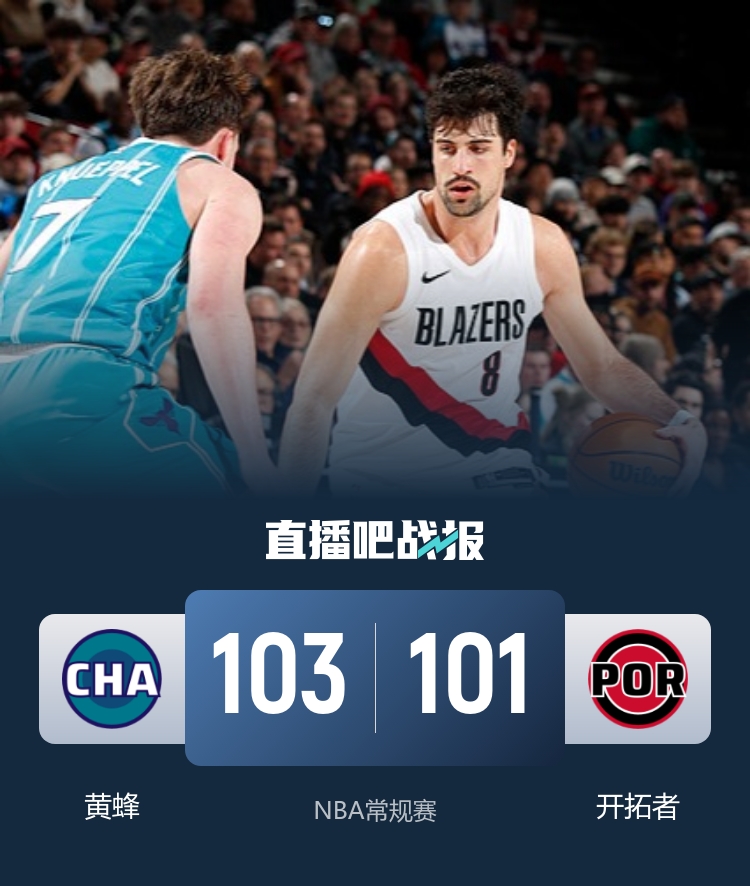 🏀黄蜂19分逆转开拓者止连败 杨瀚森下放 格兰特24分 米勒23+9