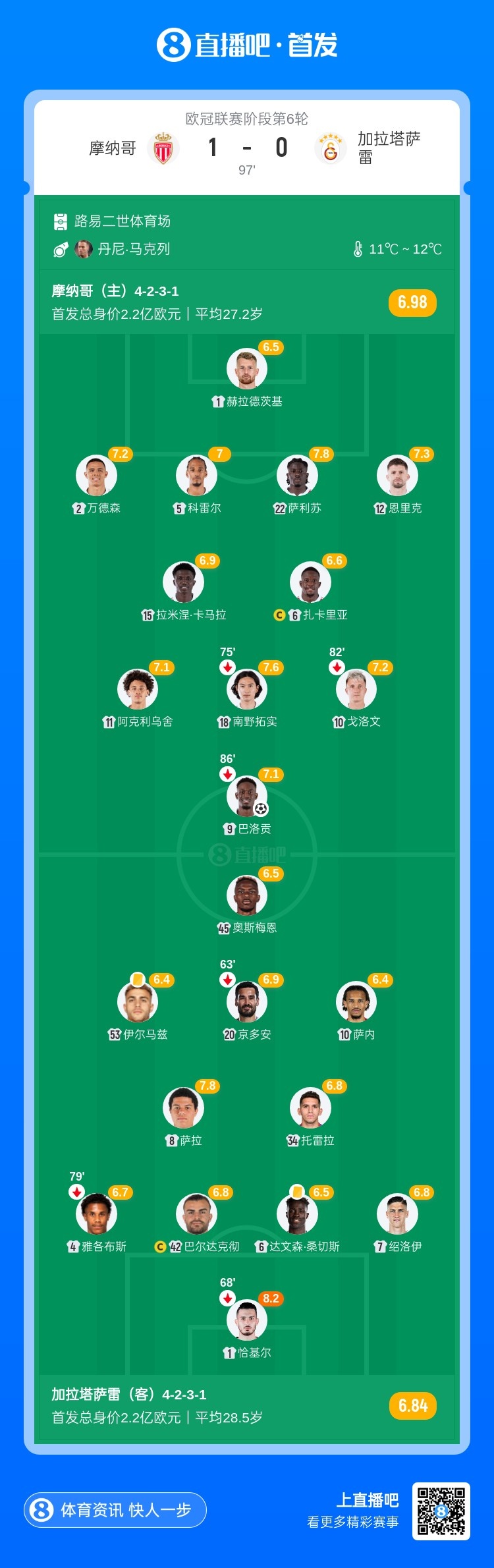 古文茨登场后,摩纳哥主罚角球,禁区内一片混乱,门前巴洛贡机敏破门!摩纳哥1-0领先加拉塔萨雷↓