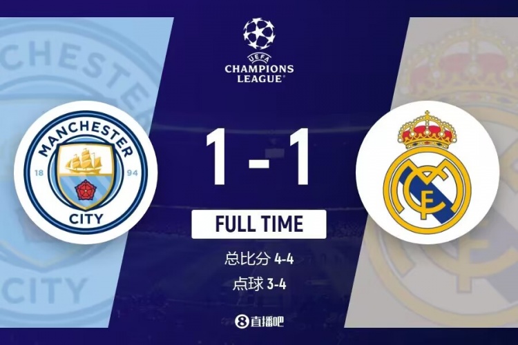 最终皇马点球大战4-3战胜曼城,总比分8-7晋级半决赛。