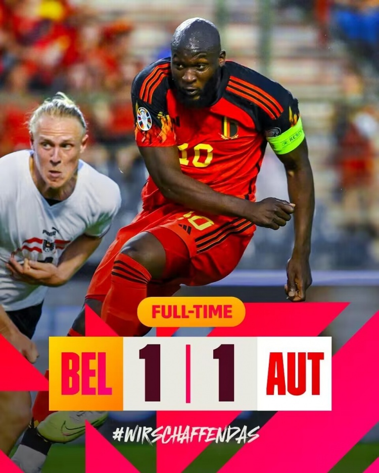 6月18日讯 北京时间6月18日凌晨2:45,欧洲杯预选赛F组第三轮,比利时对阵奥地利。上半场,格雷戈里奇打门造成曼加拉乌龙,奥地利取得领先;下半场,卢卡库远射扳平比分,补时最后时刻蒂莱曼斯远射击中横梁。全场比赛结束,比利时1-1奥地利!