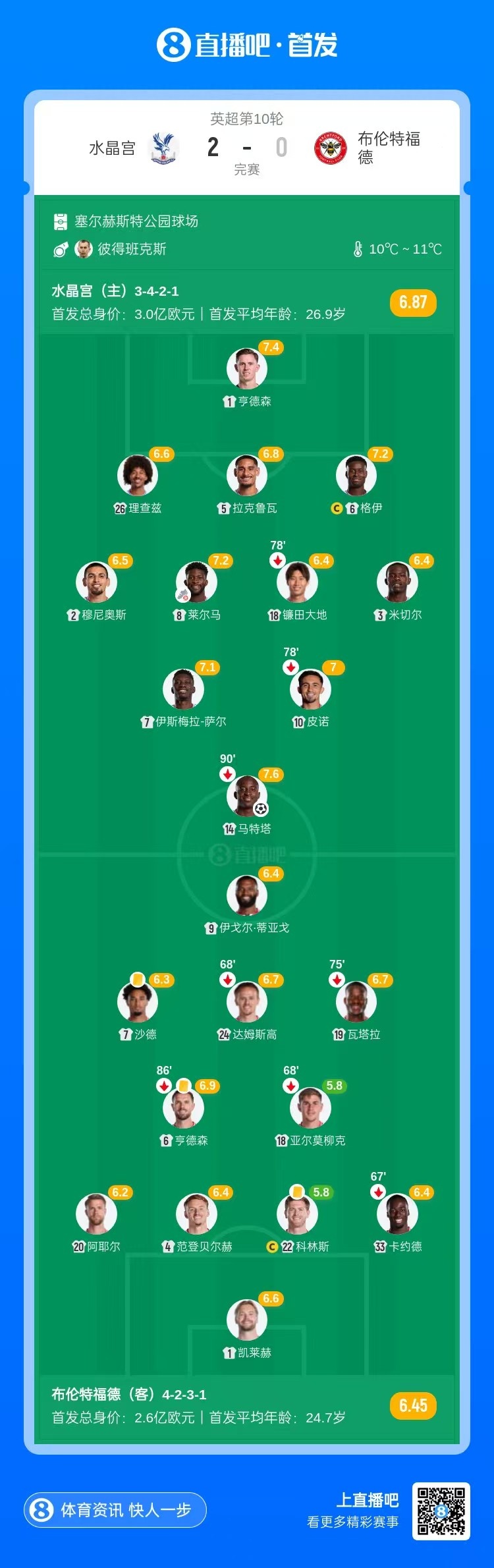 英超-水晶宫2-0终结布伦特福德3连胜 马特塔破门科林斯自摆乌龙