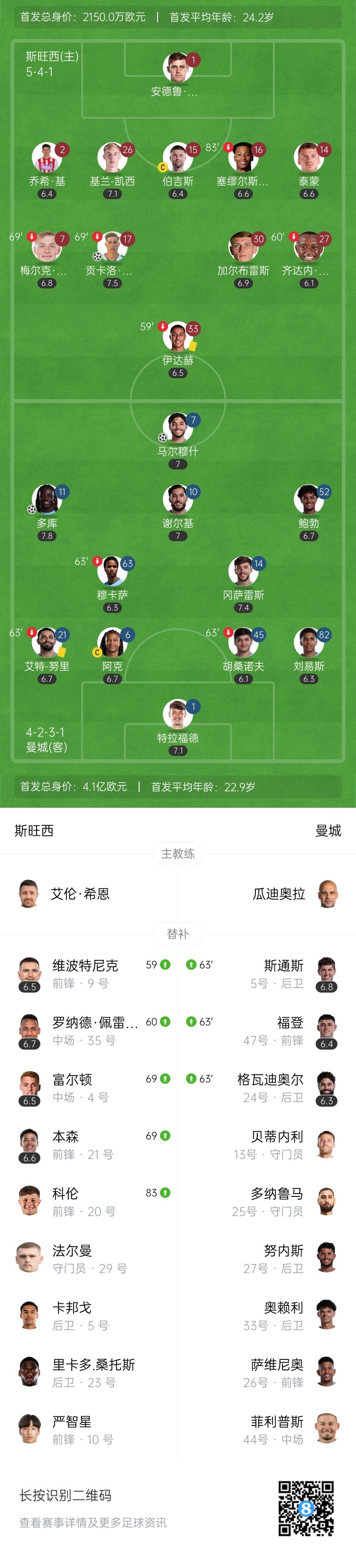 下半场伤停补时6分钟,全场比赛结束,最终曼城3-1斯旺西。