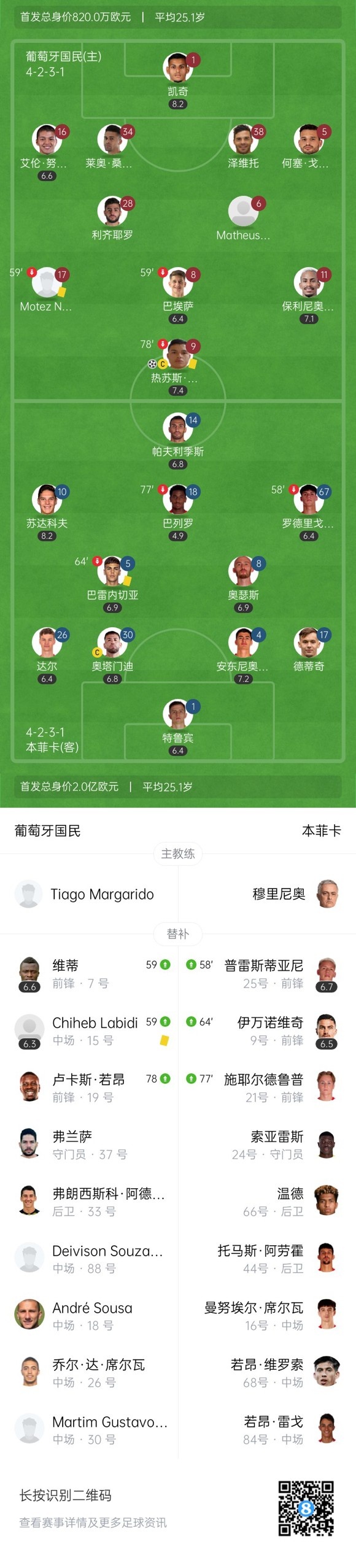 下半场补时9分钟,葡萄牙国民1-2本菲卡。