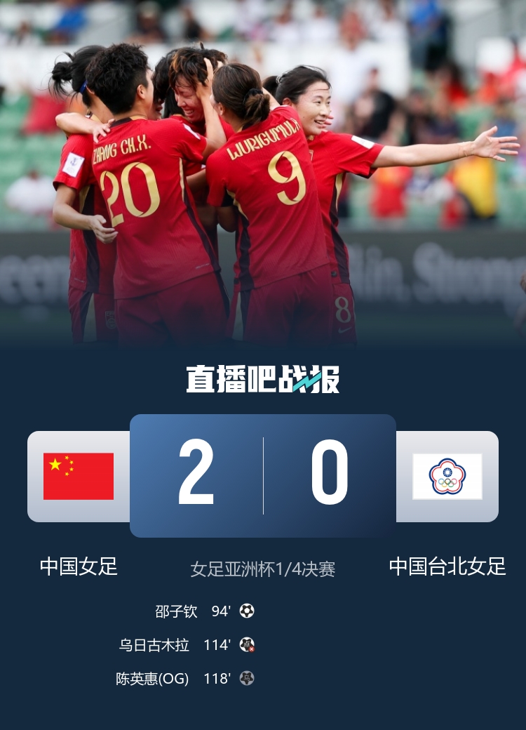 3月14日讯 北京时间3月14日13点,女足亚洲杯四分之一决赛,中国女足对阵中国台北女足。上半场,王霜打进一球但经VAR回放越位在先被吹掉。下半场,邵子钦错失良机,姚伟补时中柱。加时赛,邵子钦打破僵局,邵子钦造点,乌日古木拉点球被扑,金坤传中造成陈英惠自摆乌龙。最终中国女足2-0击败中国台北女足。半决赛中,中国女足将对阵澳大利亚女足。按照本届亚洲杯的规则,四强球队直通2027世界杯,中国女足获得了2027女足世界杯的参赛资格。中国台北女足将对阵朝鲜女足,争夺一张直通门票。