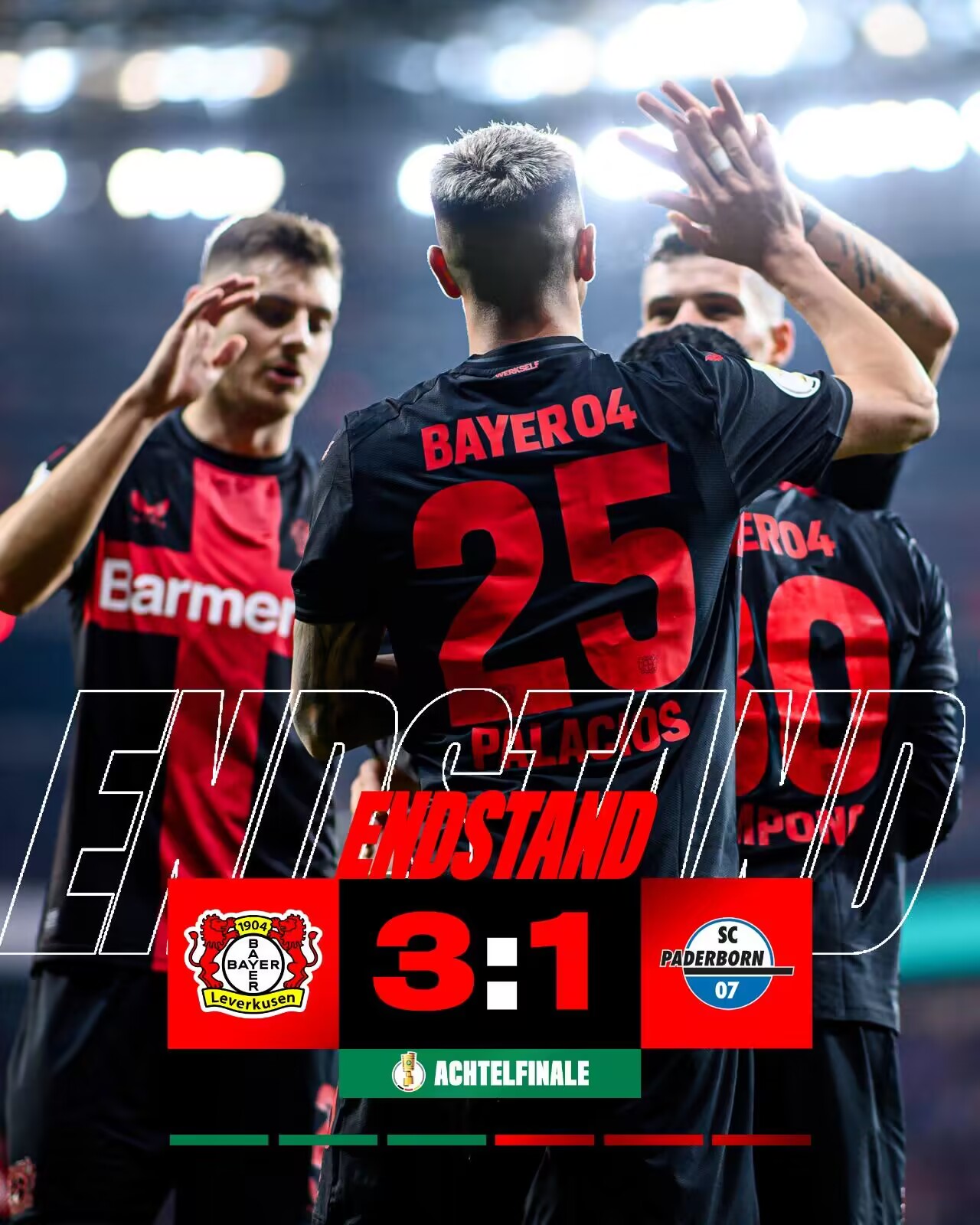 最终全场比赛结束,勒沃库森3-1帕德博恩,晋级德国杯8强。