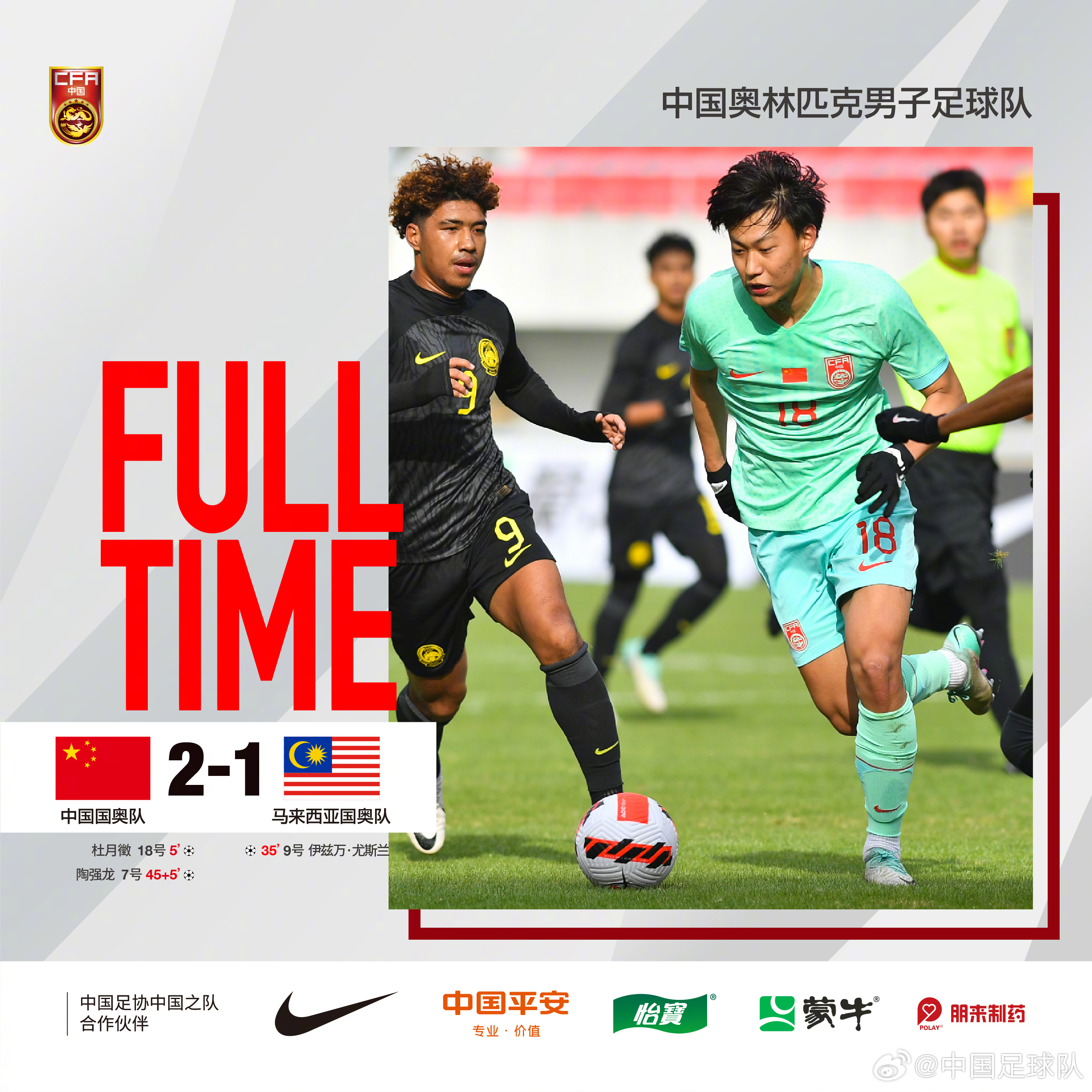 全场比赛结束,男足国奥2-1马来西亚。