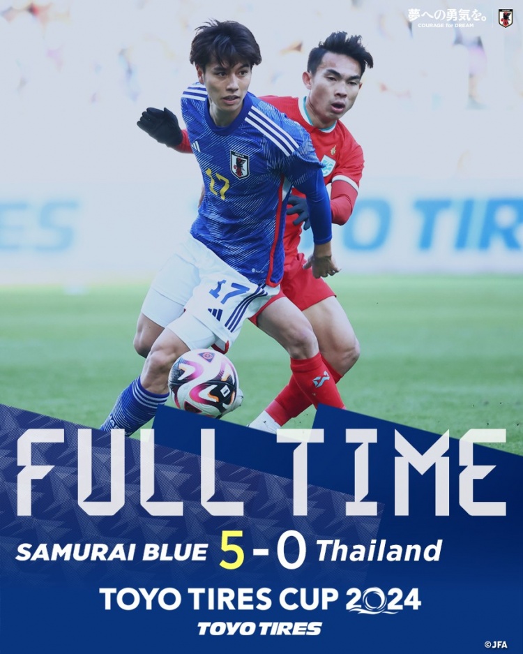 1月1日讯 北京时间1月1日13:00,日本队和泰国队在东京国立竞技场进行友谊赛。上半场,日本队牢牢占据场上优势,伊藤凉太郎和伊东纯也数次威胁泰国队球门,双方均未取得进球;下半场,田中碧破门帮助日本队取得领先,中村敬斗中柱后补射破门,多勒不慎自摆乌龙,川村拓梦、南野拓实建功。最终,日本队5-0击败泰国队,取得9连胜。