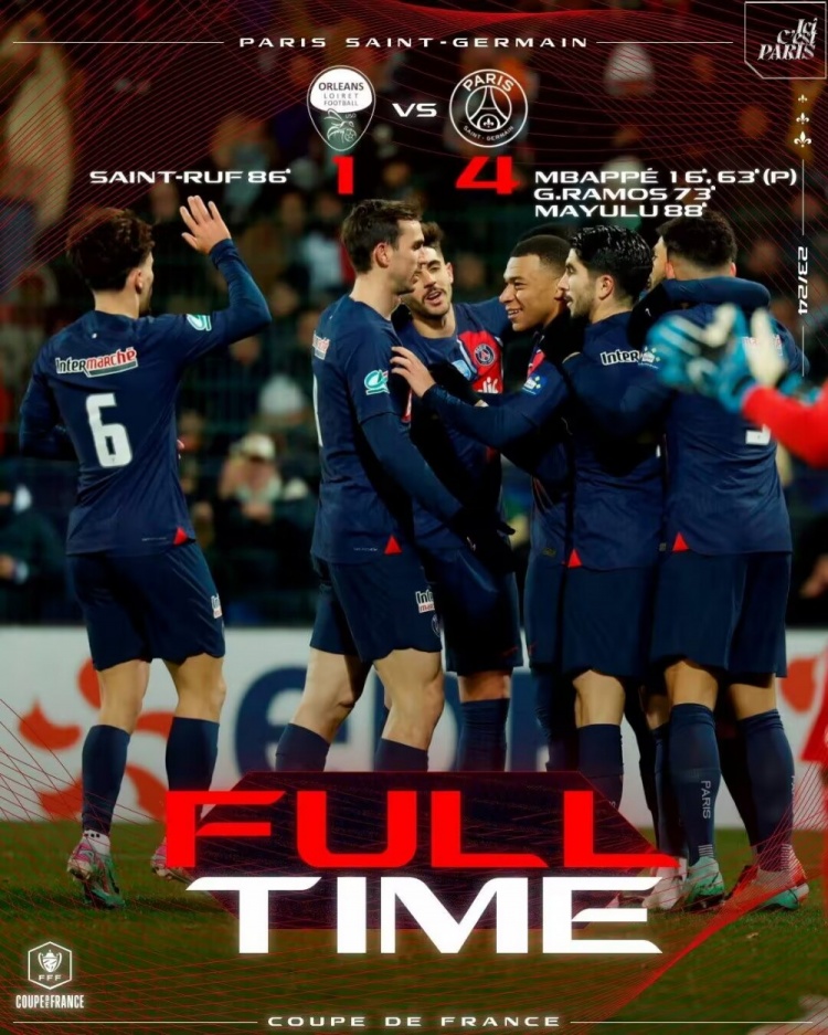 姆巴佩独造四球!第87分钟,贡萨洛-拉莫斯做球,姆巴佩再分到右路,马尤卢小角度挑射得分,奥尔良1-4巴黎圣日耳曼!↓