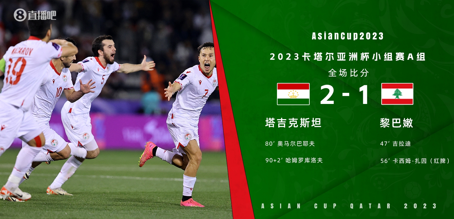 1月23日讯 北京时间23:00,亚洲杯A组第3轮,塔吉克斯坦vs黎巴嫩。本场比赛与国足vs卡塔尔同时开球。上半场补时阶段,马巴绍耶夫为塔吉克斯坦破门被吹;下半场,吉拉迪闪击破门,泽因染红,贾利洛夫进球被吹,乌马巴耶夫任意球直接破门扳平比分,斯鲁尔92分钟头球破门。最终,塔吉克斯坦2-1逆转10人黎巴嫩,小组第2直接出线,黎巴嫩小组垫底出局。