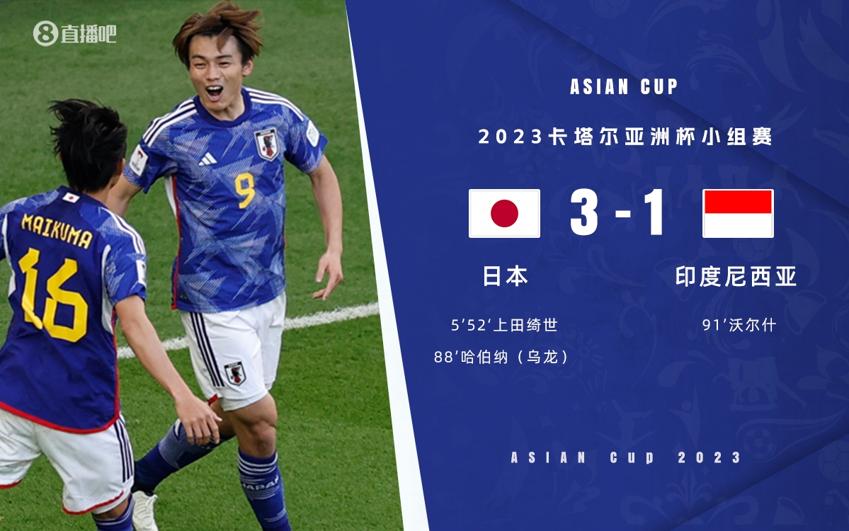 1月24日讯 北京时间19:30,亚洲杯D组末轮,日本vs印度尼西亚。上半场,上田绮世开场造点,亲自主罚命中,中村敬斗中柱;下半场日本团队配合,上田绮世空门完成双响,最后阶段上田绮世造乌龙,印尼补时扳回一球。最终,日本3-1印度尼西亚,小组第2直接晋级。
