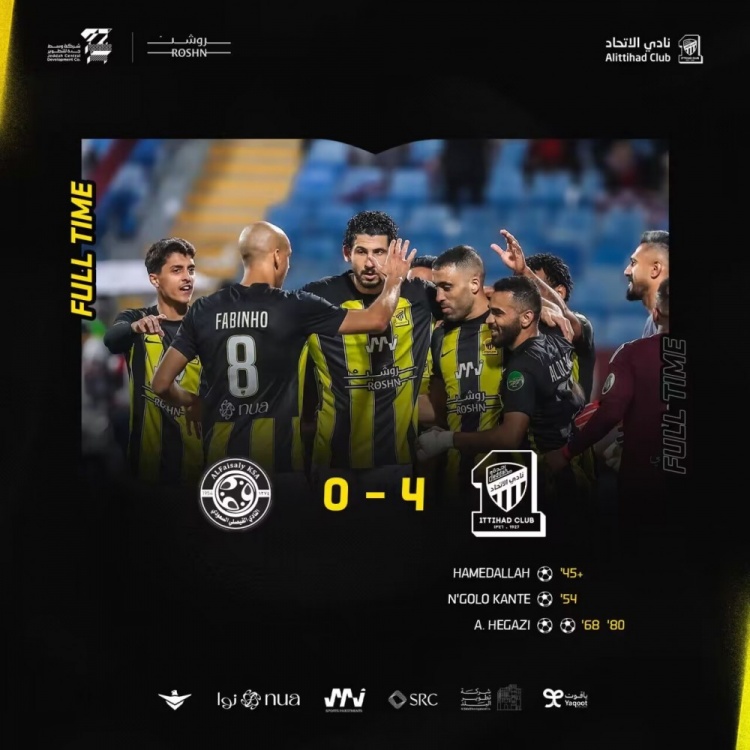 沙王冠-吉达联合4-0阿尔费萨里晋级四强 坎特世界波赫加齐双响