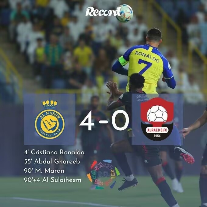 第4分钟,利雅得胜利打开记录!叶海亚前场单刀机会被扑,右路哈纳姆传到门前C罗高高跃起头球破门,利雅得胜利1-0布赖代先锋。↓