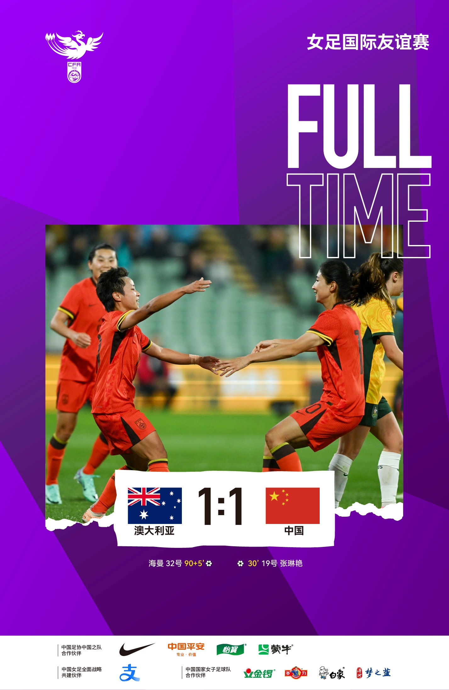 第95分钟,澳大利亚任意球开出,徐欢扑球脱手,海曼补射扳得手!1-1!澳大利亚女足读秒扳平!↓
