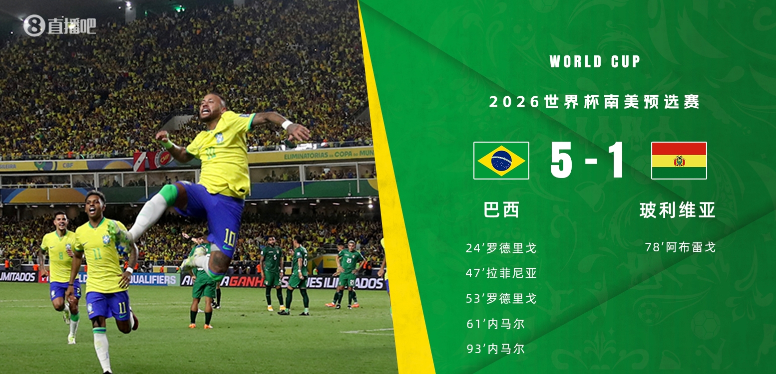 9月9日讯 世预赛南美区首轮,巴西主场vs玻利维亚。上半场,罗德里戈造点+破门,内马尔主罚点球绵软无力离谱失点,后续内马尔上演精彩个人秀。易边再战,拉菲尼亚破门,罗德里戈完成双响,内马尔打进个人第78球、第79球独享巴西队史射手王!埃布拉戈扳回一城。最终巴西5-1玻利维亚迎来开门红。
