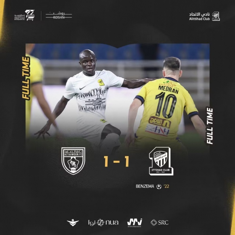 沙特联-吉达联合1-1布赖代合作三轮不胜 本泽马头球破门+乌龙球