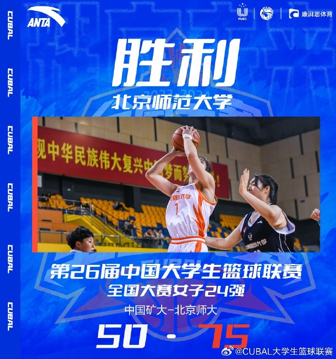 第四节,北京师大进攻回暖,内外开花打出11-2的攻击波再度将分差拉开到20分以上,中国矿大连续打铁失误,北京师大持续发力将优势扩大到30分以上,最终,北京师大75-50大胜中国矿大。