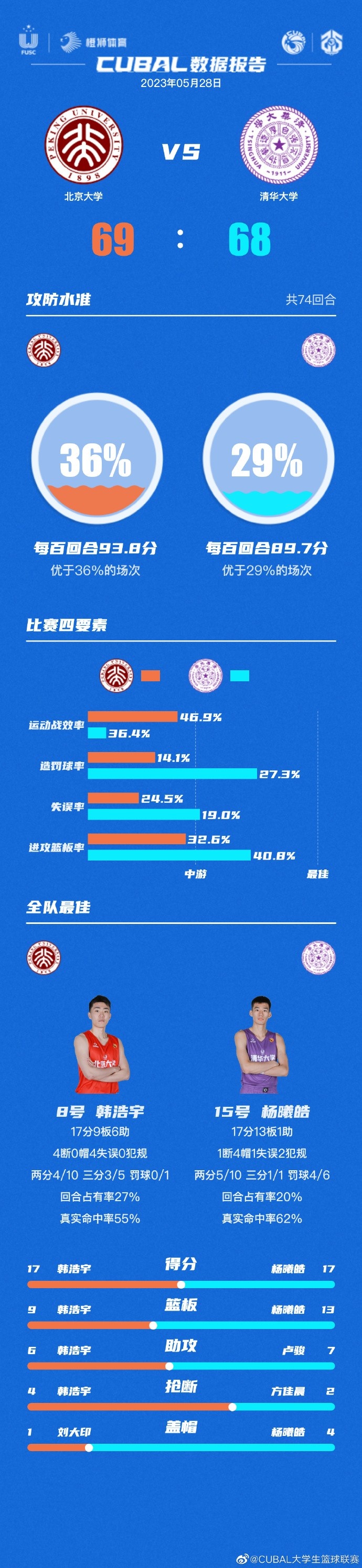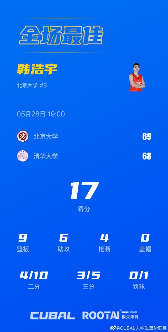 末节决战,又是韩浩宇上来抢断反击一条龙轻松上篮,但方佳晨杀内线也能再次追上比分,.杨曦皓空篮吃饼再次反超回来,但韩浩宇开启杀神模式三分还能再进,程澜莘三分再进锦上添花,温淞三分强势回应还能咬住,双方接连错失机会,昂萨尔不讲理三分再次扔进,杨曦皓内线吃饼止血后,方佳晨关键中投不中错失追平机会,李苑鑫两罚一中,方佳晨造杀伤两罚全中但时间只剩2秒,最终北京大学69-68逆转险胜清华大学,先下一城。