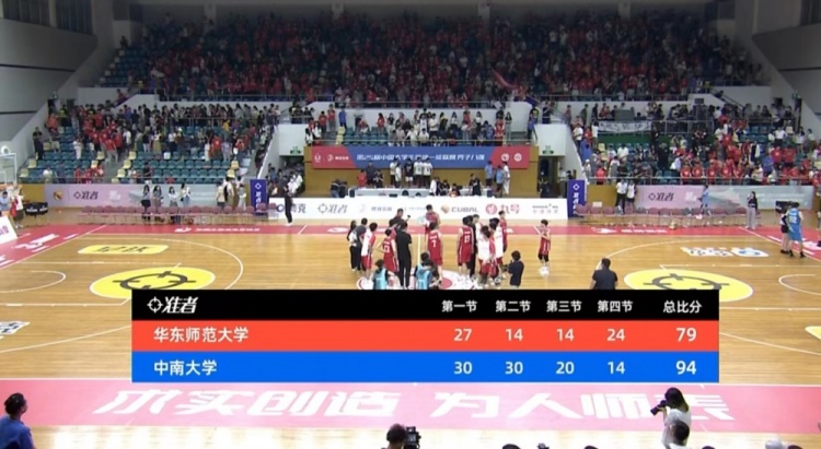 第四节,王子琛独中两记三分帮助球队保持大比分领先,华东师大不断杀入油漆区拿分苦苦支撑,王子琛出现违体犯规但卢嘉俊两罚不中,过大的分差让比赛早早失去悬念,卢嘉俊连中两记三分。最终,中南大学94-79再胜华东师大,挺进4强。