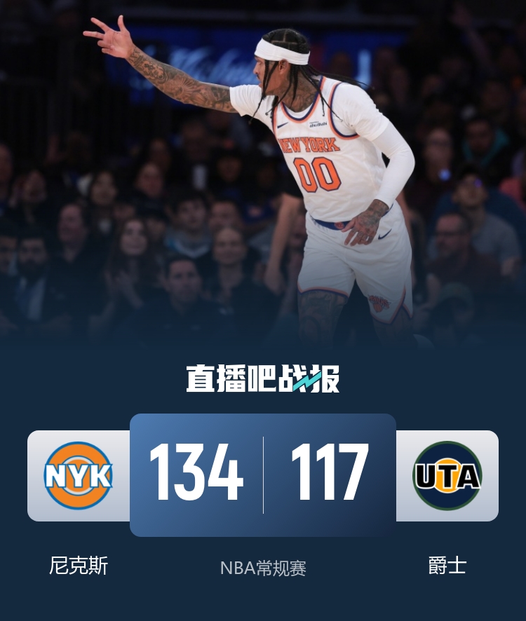 上半场,双方开场短暂相持,随后爵士连中三分逐渐占据场上主动,尼克斯冲击内线连投带罚追赶,次节爵士一度将分差拉开到18分,尼克斯及时回暖打出11-2的攻击波,半场战罢爵士65-56领先尼克斯。下半场,尼克斯大举反击,单节轰下40分完成反超,末节尼克斯越战越勇将优势扩大到两位数,爵士后劲不足,分差被拉开到20分以上。最终,尼克斯134-117逆转爵士,客场过关。