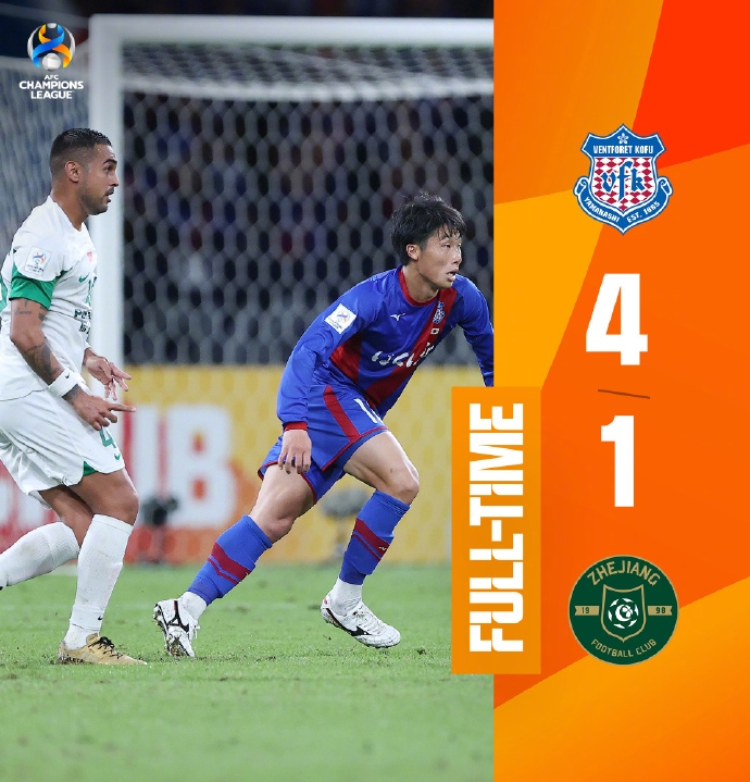 亚冠-浙江1-4甲府风林暂积3分垫底 1胜3负小组出线告急