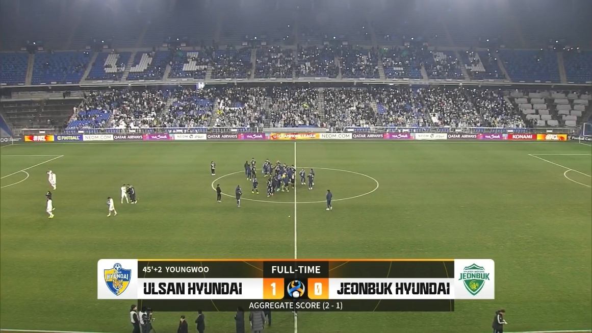 3月12日讯 北京时间3月12日,亚冠1/4决赛次回合,蔚山HD对阵 全北现代。上半场比赛,补时阶段薛英佑破门,下半场比赛,双方未能改写比分。全场比赛结束,蔚山HD1-0战胜全北现代总比分2-1挺进四强,蔚山HD下一轮的对手将是山东泰山与横滨水手之间的胜者。