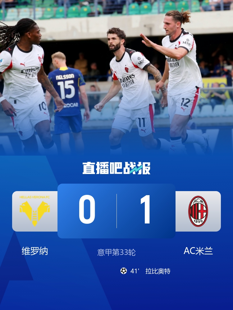 4月19日讯 北京时间4月19日晚上21:00,意甲第33轮,AC米兰做客本特戈蒂球场挑战维罗纳。上半场,奥耶戈克伤退,莱奥助攻拉比奥特破门。下半场,加比亚进球被吹。全场比赛结束,AC米兰1-0维罗纳。本场过后,AC米兰终结联赛2连败、积66分排第二,维罗纳积18分排名第20。