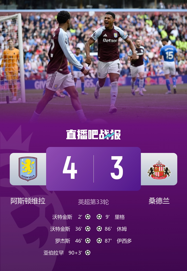 比赛伤停补时第3分钟,亚伯拉罕禁区内踹射破门,绝杀桑德兰,阿斯顿维拉4-3领先桑德兰↓