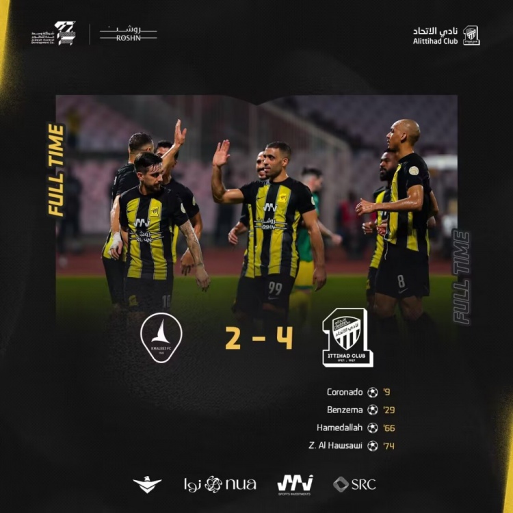 吉达联合首发:34-格罗赫、4-奥马尔-豪萨维、5-路易斯-费利佩、12-扎卡里亚-豪萨维、13-山凯蒂、8-法比尼奥、16-加姆迪、77-阿姆里(45'52-哈吉)、10-科罗纳多(84'24-阿布德)、99-哈姆达拉、9-本泽马(36'70-哈伦-卡马拉)