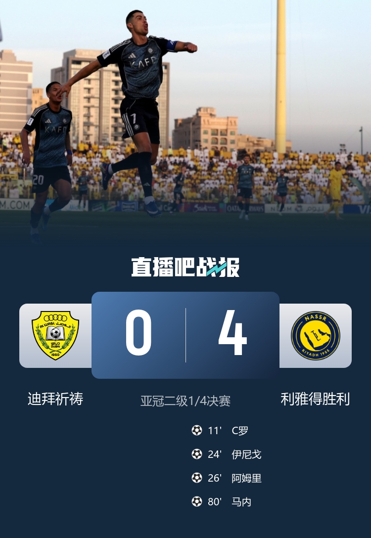 4月19日讯 北京时间4月19日晚上22:00,亚冠二级1/4决赛,利雅得胜利做客扎比尔体育场挑战迪拜祈祷。上半场,C罗推射破门打进生涯第969球,菲利克斯助攻伊尼戈·马丁内斯再下一城,菲利克斯助攻双响,阿姆里头槌。下半场,马内锦上添花。全场结束,利雅得胜利4-0迪拜祈祷,晋级四强。