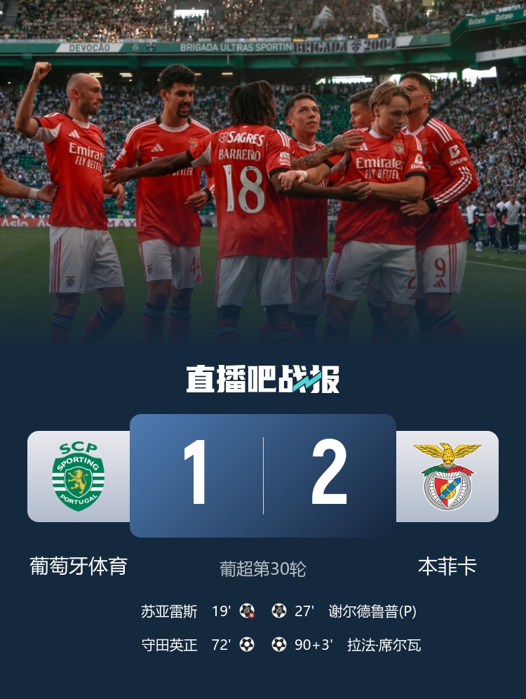 4月20日讯 北京时间1:00,葡超第30轮葡萄牙体育vs本菲卡,比赛在阿尔瓦拉德球场打响!上半场,特林康造点,路易斯·苏亚雷斯点球被特鲁宾扑出;守田英正手球送点,谢尔德鲁普点射命中!下半场,德巴斯特助攻守田英正扳平比分!内尔91分钟进球被判无效,拉法·席尔瓦93分钟绝杀!最终,本菲卡客场2-1战胜葡萄牙体育,本赛季葡超30轮未尝败绩,但仍落后榜首波尔图4分,暂列积分榜第2;葡萄牙体育被反超,排名第3。