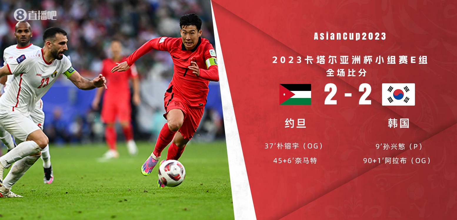 1月20日讯 北京时间19:35,男足亚洲杯E组第二轮,约旦vs韩国。上半场,孙兴慜造点亲自主罚命中,朴镕宇头球乌龙,半场补时奈马特破门;下半场补时阶段,黄仁范造乌龙帮助韩国队绝平。最终,韩国2-2战平约旦,末轮将战马来西亚;约旦末战巴林。