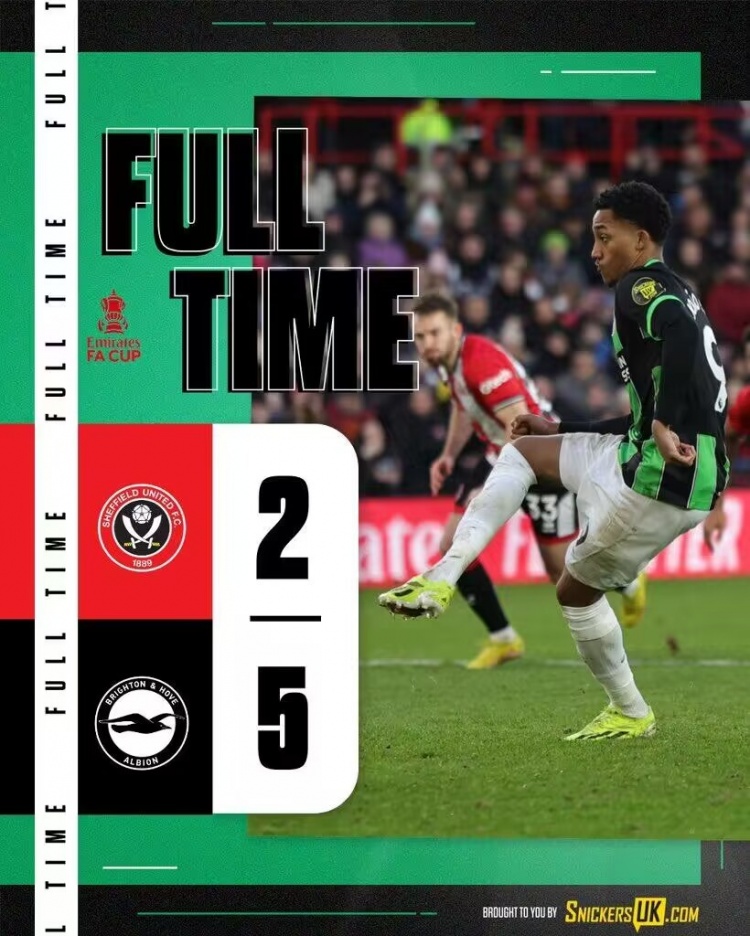 全场比赛结束,布莱顿5-2谢菲尔德联。