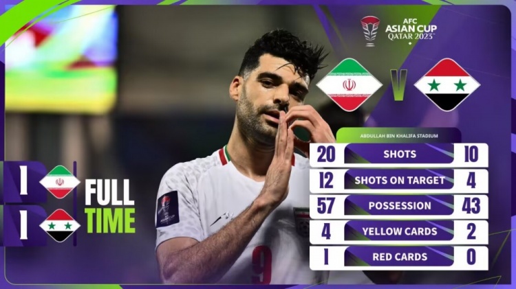 全场比赛结束,两队120分钟战成1-1,伊朗点球大战5-3叙利亚。最终,伊朗总比分6-4淘汰叙利亚。