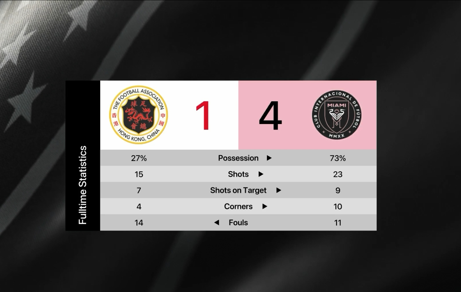 伤停补时3分钟。全场比赛结束,迈阿密国际4-1中国香港全明星。