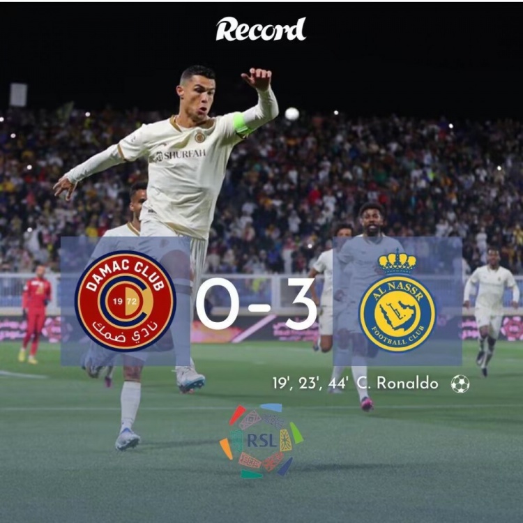 沙特联-C罗半场戴帽4轮8球 利雅得胜利3-0达马克三连胜返榜首