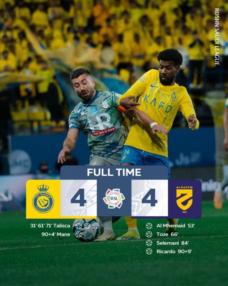 下半场补时9分钟,利雅得胜利4-4哈森姆。