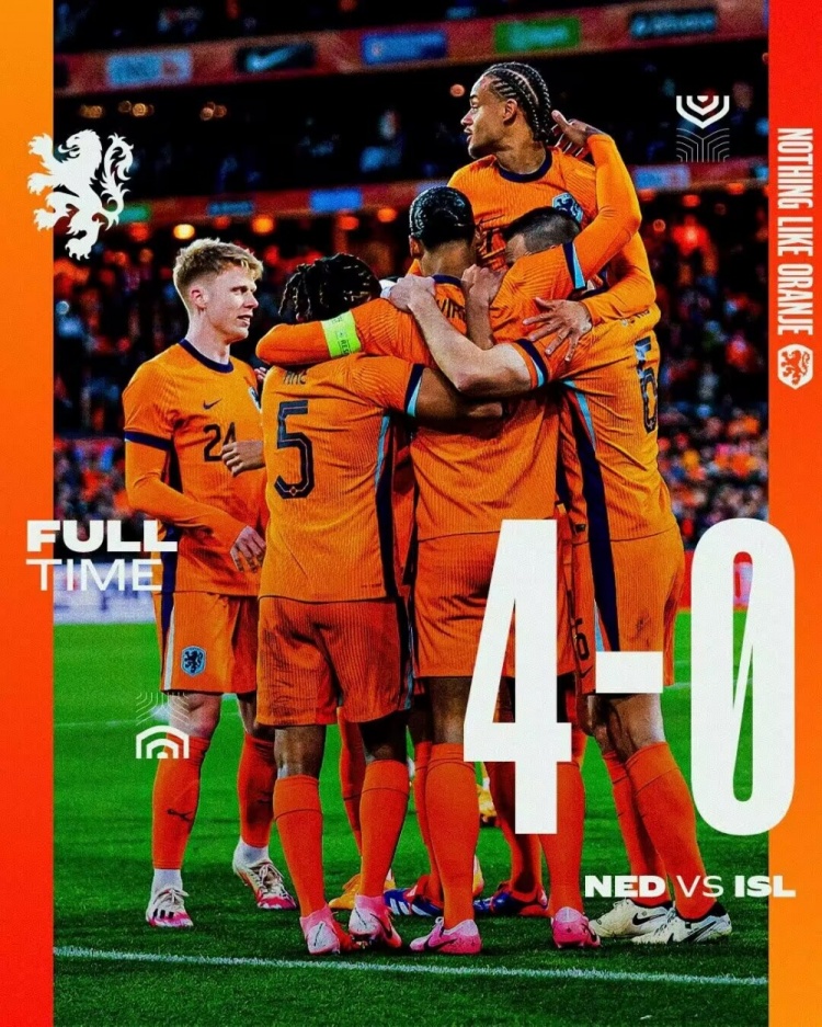 友谊赛-荷兰4-0冰岛 哈维-西蒙斯处子球范迪克破门马伦传射