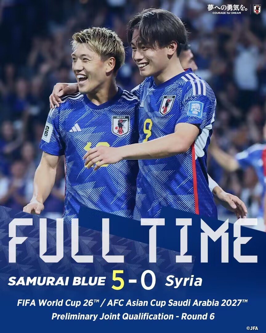 全场比赛结束,日本5-0叙利亚。