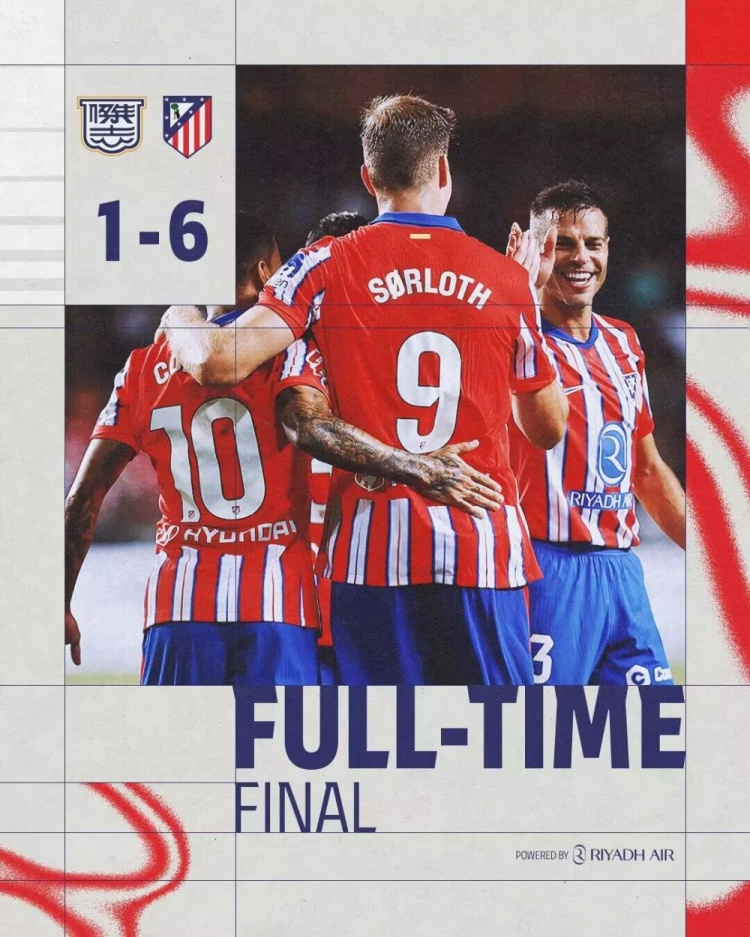 8月7日讯 足球友谊赛,港超杰志迎战马德里竞技。上半场,马竞新援索尔洛特2分钟2球。易边再战,卡洛斯-马丁、圣地亚哥-穆里尼奥、尼诺、勒马尔再进四球,舍尔佐德反击爆射扳回一城。最终马竞6-1杰志。