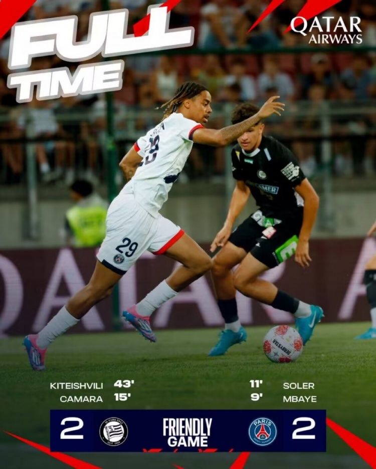 第43分钟,基泰什维利禁区前沿得球,果断起脚轰门!球进了!格拉茨风暴连扳两球!2-2巴黎↓