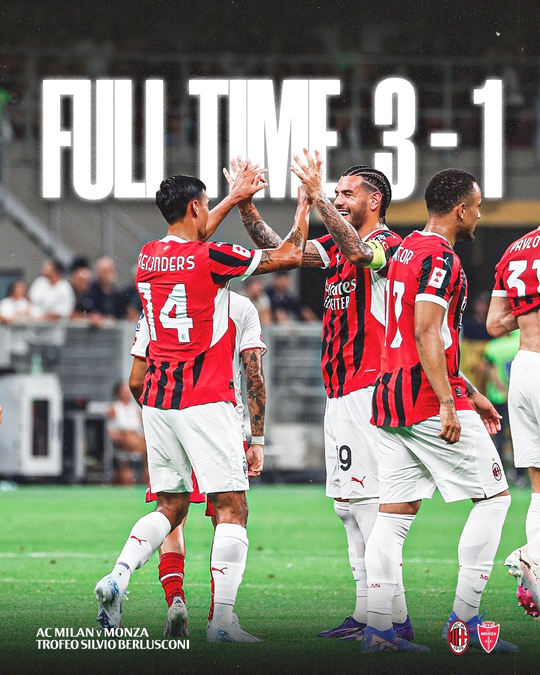 8月14日讯 北京时间3:00,贝卢斯科尼杯,AC米兰vs蒙扎。上半场,萨勒马科尔斯首开记录;小马尔蒂尼帮助蒙扎扳平。下半场,约维奇补射建功,赖因德斯轰世界波!最终,AC米兰3-1击败蒙扎,夺得贝卢斯科尼杯。