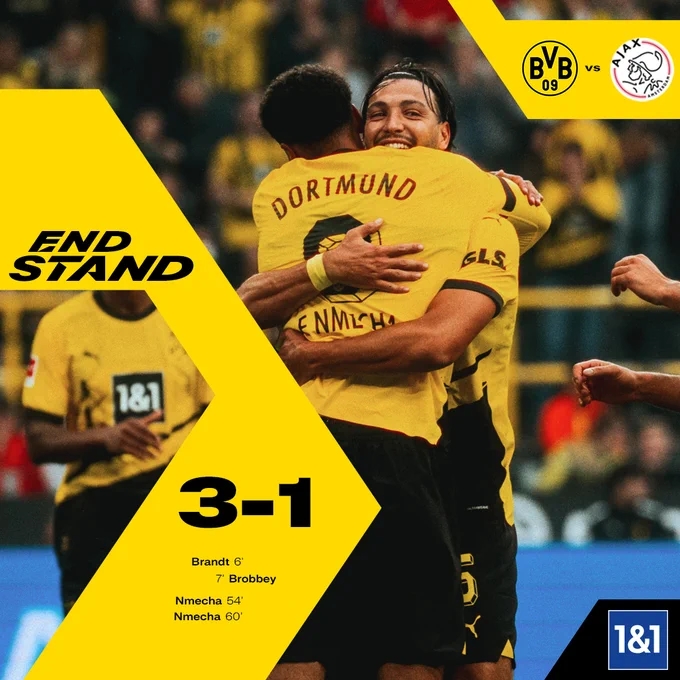 最终全场比赛结束,多特3-1阿贾克斯!