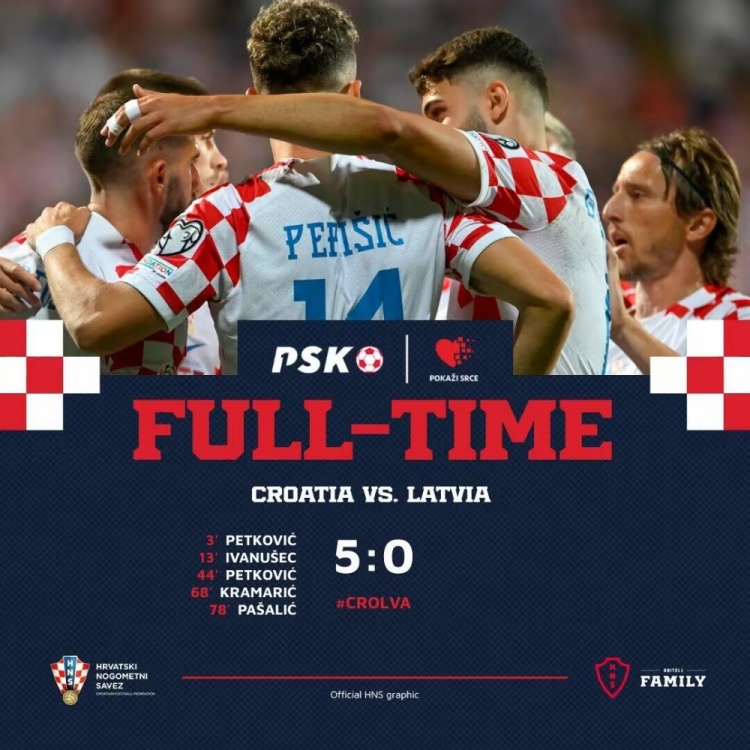 9月9日讯 北京时间9月9日02:45,欧洲杯预选赛小组赛第五轮克罗地亚主场迎战拉脱维亚的比赛,上半场佩特科维奇双响,伊万努舍茨补射破门,下半场克拉马里奇抽射扩大比分,帕萨利奇替补建功,最终克罗地亚5-0大胜拉脱维亚。